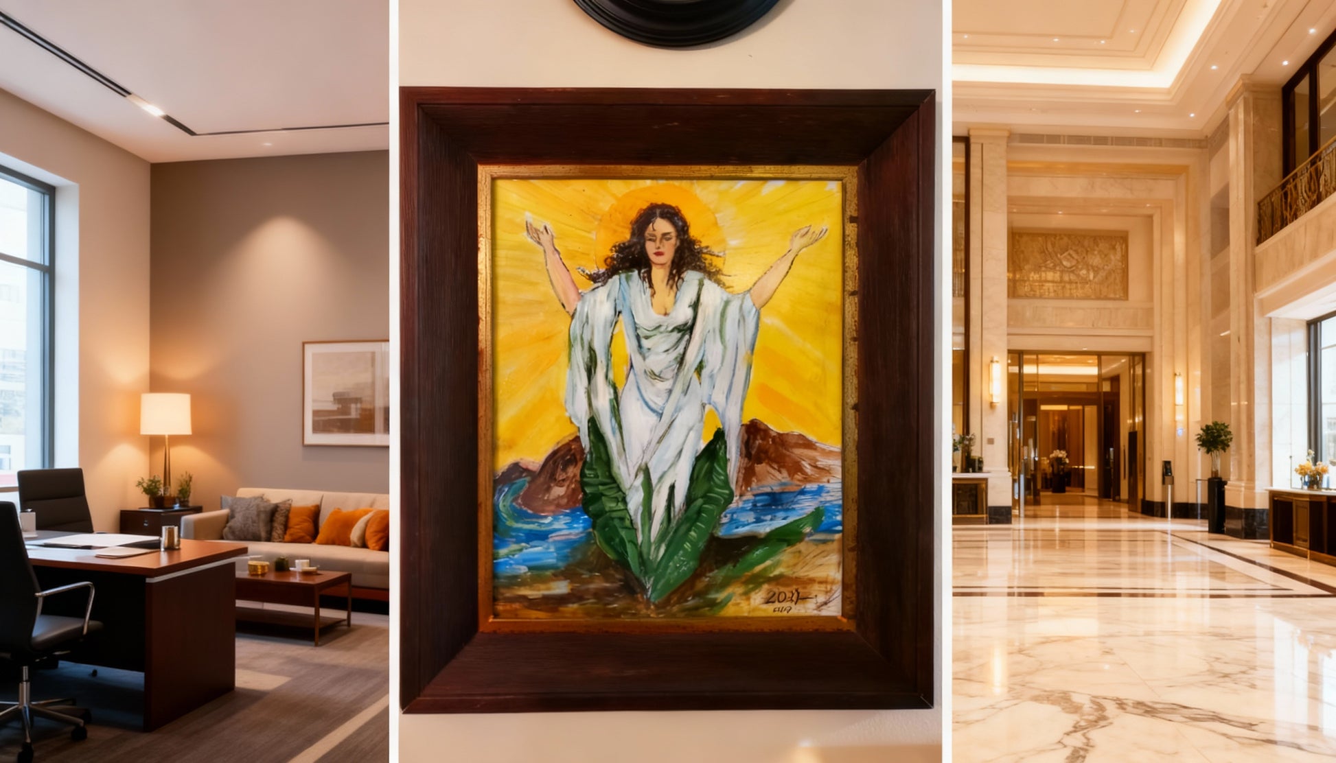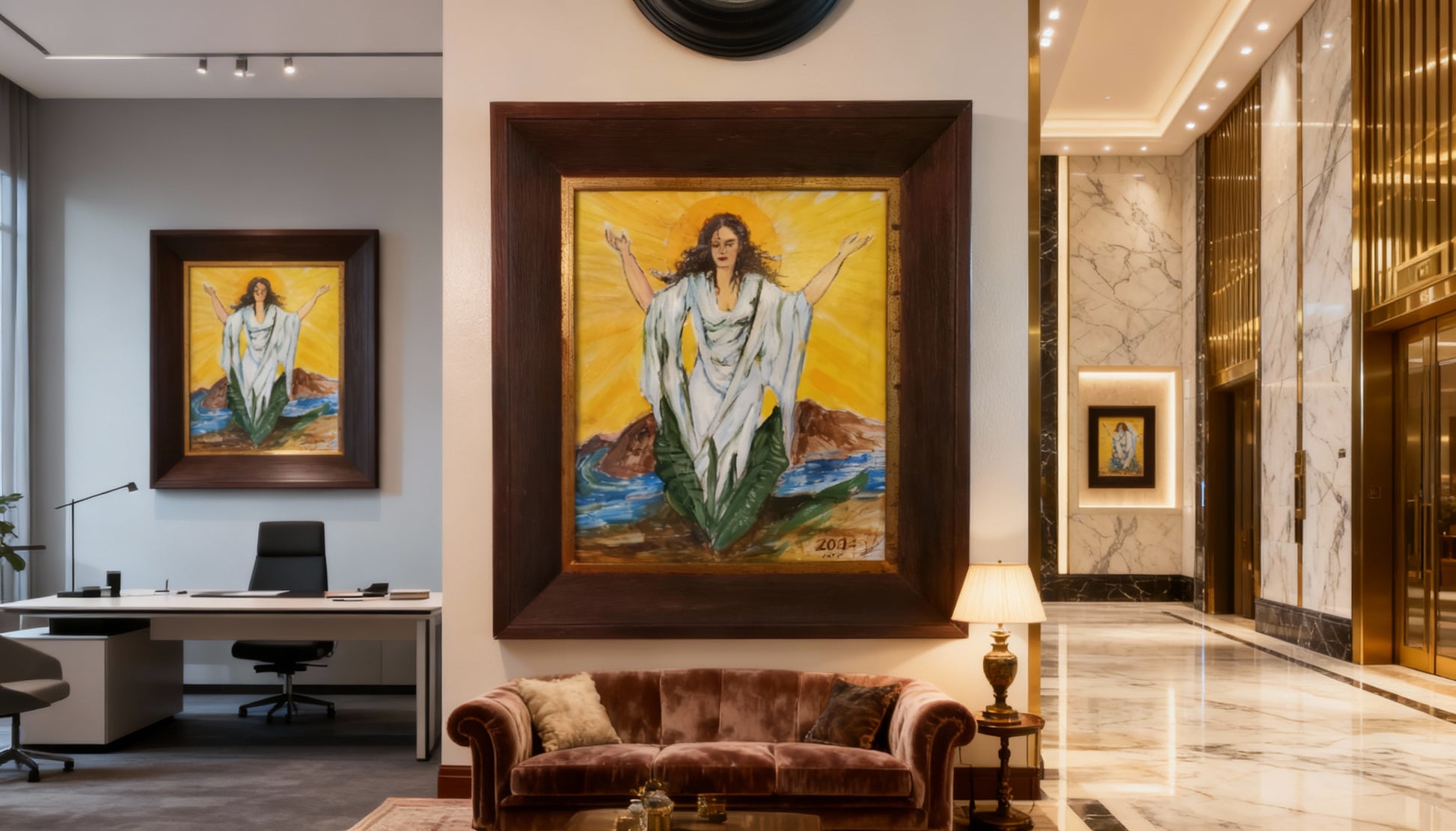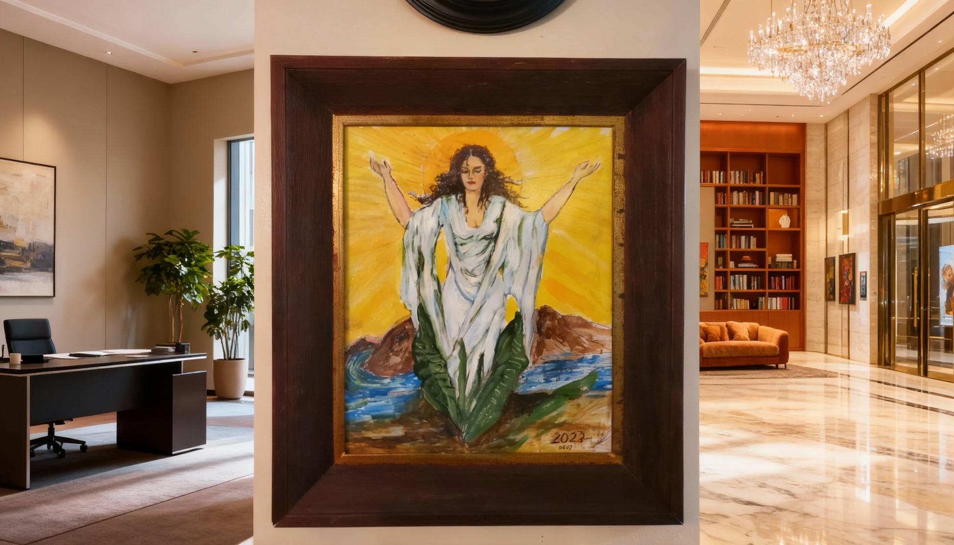 Obra original de Elsa Núñez, una de las artistas dominicanas más reconocidas por su profunda conexión con la espiritualidad y la identidad del Caribe. En esta pieza titulada “Madre Universal”, la artista combina la fuerza simbólica del mar y la tierra con la serenidad de una figura femenina que emerge como fuente de luz y vida. Realizada en técnica mixta sobre papel, esta obra fue parte del paño oficial del certamen Miss República Dominicana Universo 2023, uniendo arte, feminidad y nación en un solo gesto.